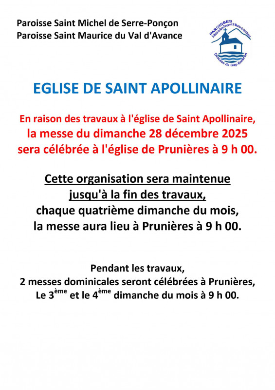 CHANGEMENT D'HEURE : A partir du 11 avril 2026, la messe anticipée du samedi à La Bâtie-Neuve sera célébrée à 18h30.